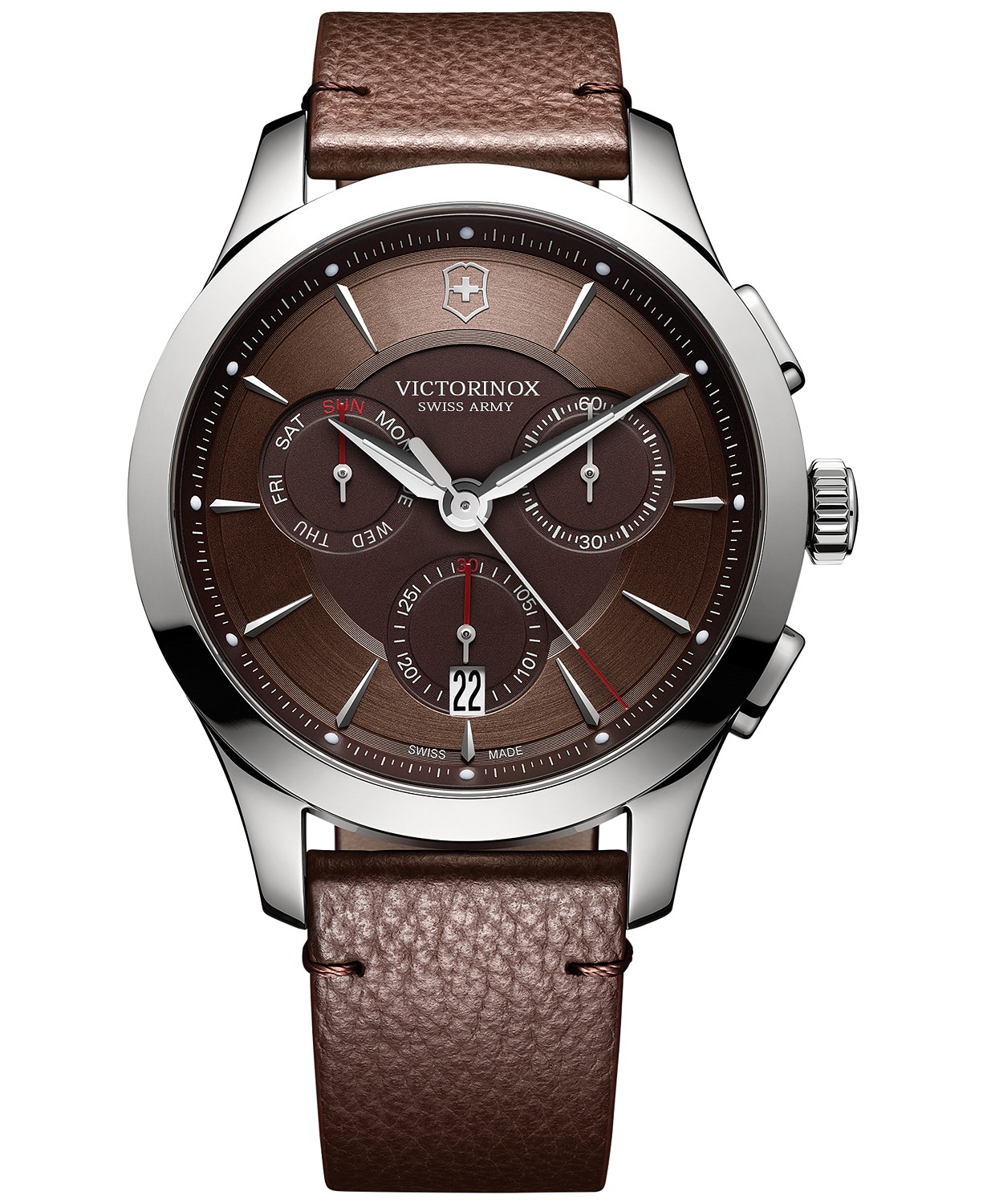 A brown chronograph dial perfectly matches the sharp leather strap of this handsome Alliance watch created by Victorinox Swiss Army.
